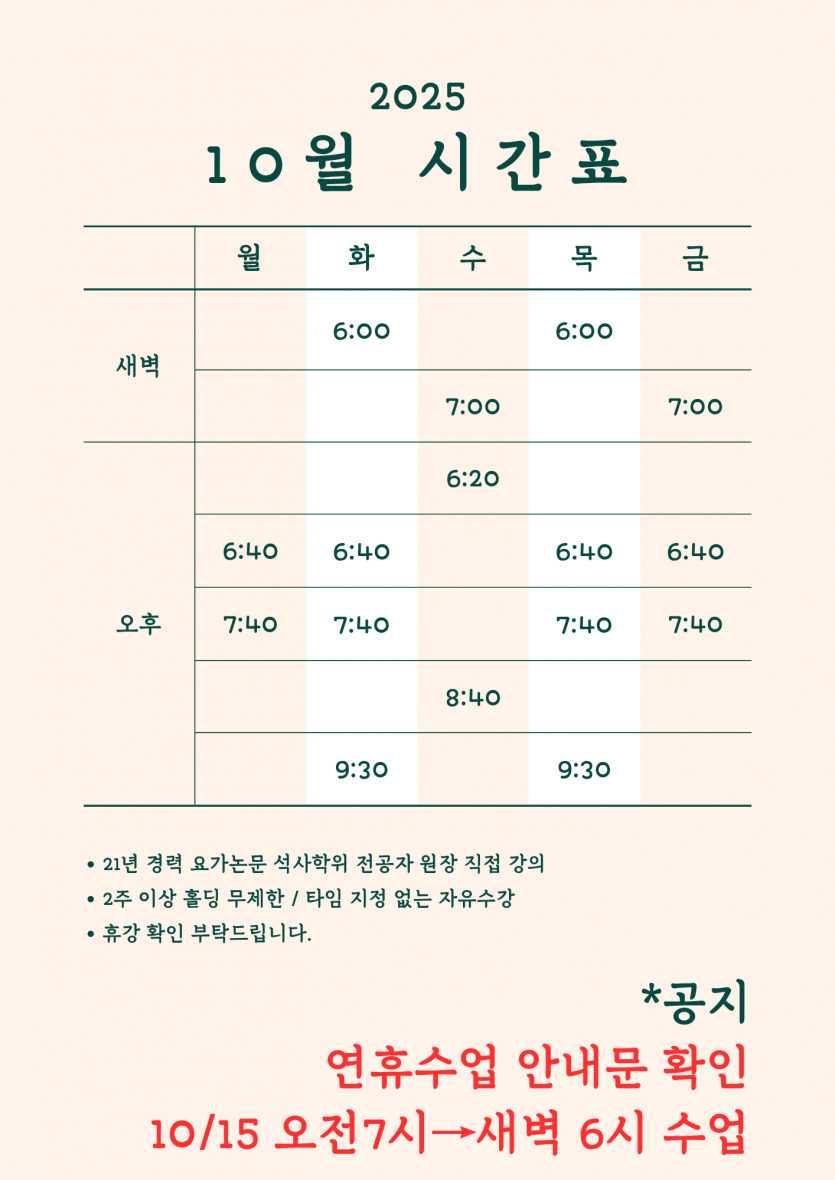 25년 10월 시간표/15일 확인요망 페이지 정보 작성자 관리자 댓글 0건 조회 104회 작성일 25-09-25 16:21 목록 본문 휴무와 15일 새벽수업시간 확인부탁드립니다. 이전글25년 10월 추석연휴 수업안내 25.09.25 다음글25년 9월 시간표/휴강 안내 25.08.26